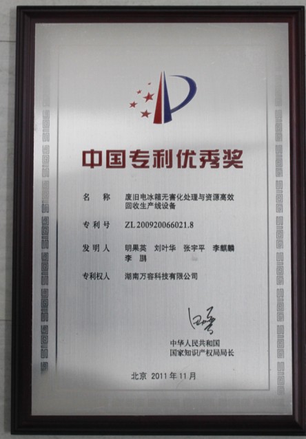 喜訊:湖南萬容科技股份有限公司的實用新型專利廢舊電冰箱無害化處理與資源高效回收生產(chǎn)線設備被授予第十三屆中國專利優(yōu)秀獎。萬容科技該項獲獎專利自2009年底實施推向市場以來,生產(chǎn)并銷售給有關行業(yè)企業(yè)...