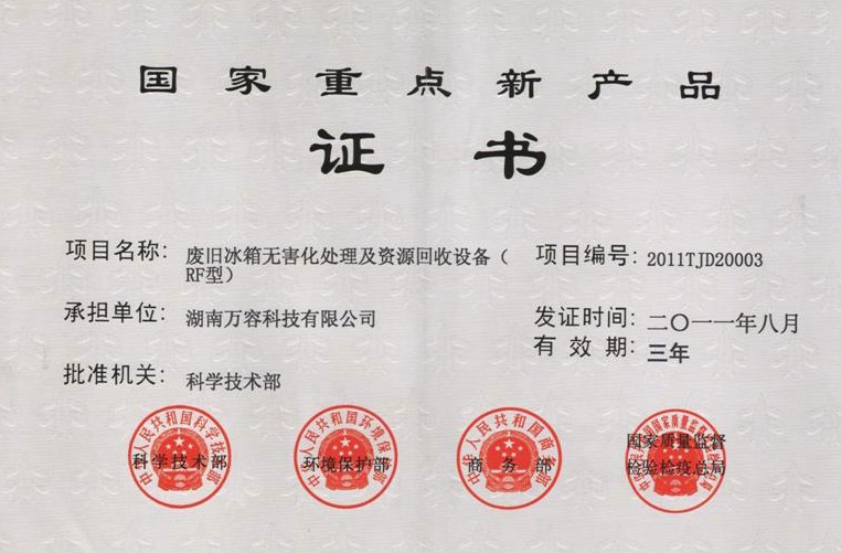 近日,萬容科技自主研發(fā)的廢舊冰箱無害化處理及資源回收設備被國家科技部、環(huán)保部、商務部、質(zhì)量監(jiān)督檢驗檢疫總局認定為國家重點新產(chǎn)品。 此項資質(zhì)榮譽說明了有關部門對萬容科技該項產(chǎn)品的科技、質(zhì)量、價...
