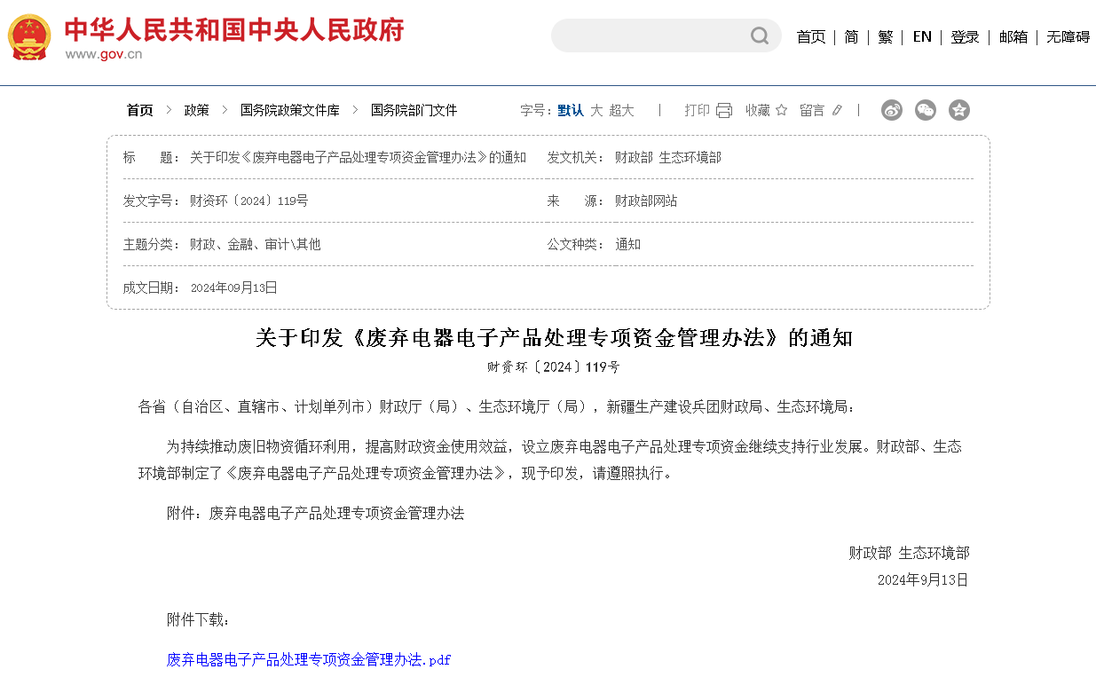 近日,財政部、生態(tài)環(huán)境部聯(lián)合發(fā)布的《廢棄電器電子產(chǎn)品處理專項資金管理辦法》(以下簡稱《辦法》)引起了廣泛關(guān)注?!掇k法》是由財政部和生態(tài)環(huán)境部聯(lián)合制定并印發(fā)的一項政策文件,作為廢棄電器電子產(chǎn)品...