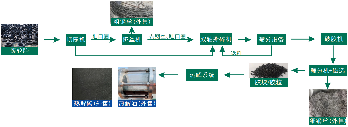 采用無(wú)氧熱解技術(shù),實(shí)現(xiàn)廢輪胎、塑料的物理化學(xué)回收,解決困擾世界難題的“白色污染”及“黑色污染”。針對(duì)廢輪胎提供破碎分選設(shè)備、前端預(yù)處理及終端熱解、廢輪胎綜合利用整廠系統(tǒng)服務(wù)。在安全、環(huán)保、連續(xù)穩(wěn)定運(yùn)行的前提下,廢輪胎(廢舊橡膠制品)最終轉(zhuǎn)化為鋼絲、熱解油、熱解碳,實(shí)現(xiàn)資源化、無(wú)害化、減量化處置。包裝廢塑料、分揀后城市垃圾、工業(yè)廢塑料、農(nóng)膜、紙廠垃圾等無(wú)法再進(jìn)行直接利用,經(jīng)破碎、分選、無(wú)氧熱解后,最終轉(zhuǎn)化為高熱值的能源化產(chǎn)品熱解油、熱解碳,實(shí)現(xiàn)資源化、無(wú)害化、減量化處置。